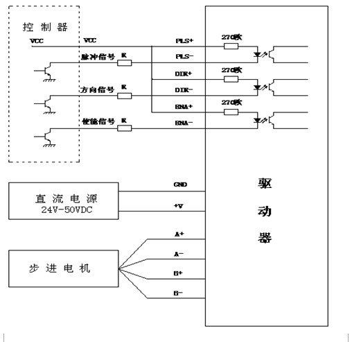 一個(gè)完整的步進(jìn)電機(jī)控制系統(tǒng)應(yīng)含有步進(jìn)驅(qū)動(dòng)器、直流電源以及控制器(脈沖源)。以下為典型系統(tǒng)接線圖: