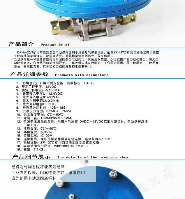 DFH一20/7礦用本質(zhì)安全型電動(dòng)球閥適用于具危險(xiǎn)氣體的場(chǎng)合,配合ZP-127Z 礦用自動(dòng)灑水降塵裝置主控箱降低巷道煤塵、灰塵等濃度。對(duì)易燃部位起到防火、滅火作用 。