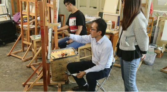 2014年在教室輔導(dǎo)學(xué)生油畫(huà)作業(yè)