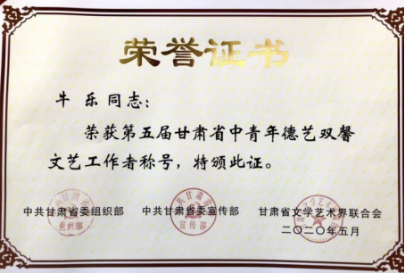 牛樂(lè)于2018年被文化和旅游部授予“全國(guó)非物質(zhì)文化遺產(chǎn)保護(hù)先進(jìn)個(gè)人”稱(chēng)號(hào)。于2020年被中共甘肅省委組織部、中共甘肅省委宣傳部、甘肅省文學(xué)藝術(shù)界聯(lián)合會(huì)授予“甘肅省第五屆甘肅省中青年德藝雙馨文藝工作者”稱(chēng)號(hào)。