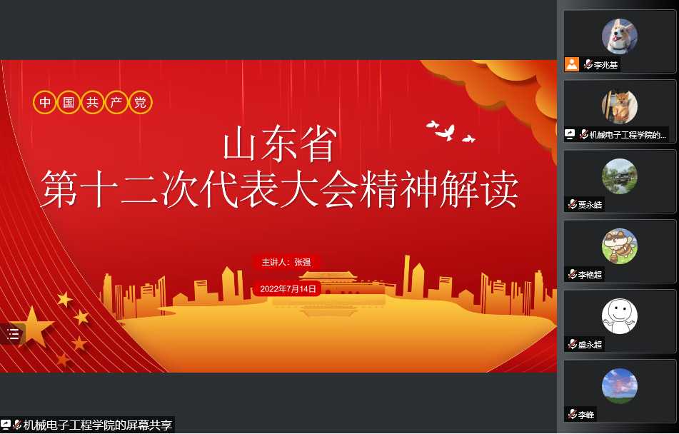 為深入學(xué)習(xí)貫徹山東省第十二次黨代會(huì)精神,進(jìn)一步統(tǒng)一思想、凝聚共識(shí),7月14日,機(jī)械電子工程學(xué)院院長(zhǎng)張強(qiáng)為小平科技創(chuàng)新團(tuán)隊(duì)黨支部講黨課,學(xué)習(xí)山東省第十二次黨代會(huì)精神。支部成員通過(guò)線上+線下結(jié)合方式參與學(xué)習(xí)。