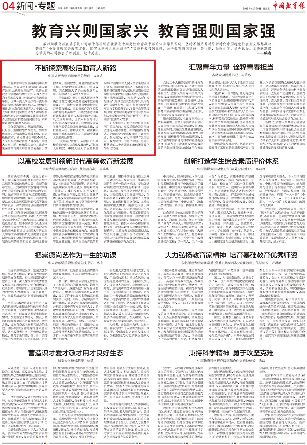 黨的二十大吹響了加快建設(shè)教育強國的號角。習(xí)近平總書記關(guān)于教育的系列重要論述,為教育強國建設(shè)提供了根本遵循。今年中共中央政治局第五次集體學(xué)習(xí)時,習(xí)近平總書記進(jìn)一步強調(diào)“建設(shè)教育強國,是全面建成社會主義現(xiàn)代化強國的戰(zhàn)略先導(dǎo),是實現(xiàn)高水平科技自立自強的重要支撐,是促進(jìn)全體人民共同富裕的有效途徑,是以中國式現(xiàn)代化全面推進(jìn)中華民族偉大復(fù)興的基礎(chǔ)工程”。