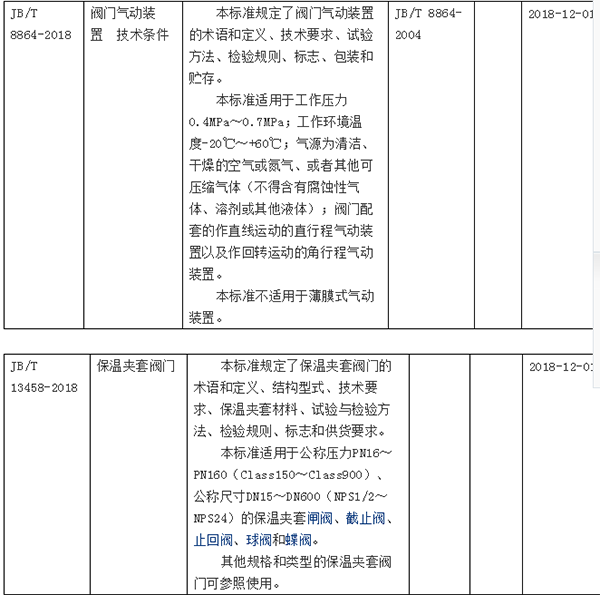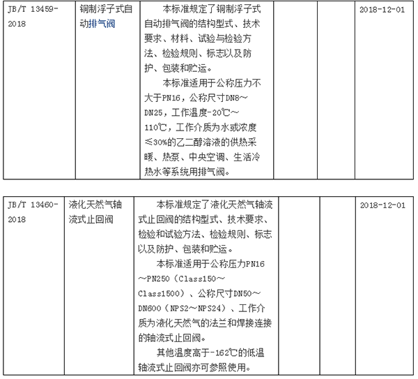 根據(jù)中華人民共和國(guó)工業(yè)和信息化部公告2018年第23號(hào),工業(yè)和信息化部批準(zhǔn)一批行業(yè)標(biāo)準(zhǔn),其中《閥門(mén)氣動(dòng)裝置技術(shù)條件》、《保溫夾套閥門(mén)》、《銅制浮子式自動(dòng)排氣閥》、《液化天然氣軸流式止回閥》4項(xiàng)閥門(mén)行業(yè)標(biāo)準(zhǔn)由全國(guó)閥門(mén)標(biāo)準(zhǔn)化技術(shù)委員會(huì)歸口,現(xiàn)予公布(見(jiàn)下表)。