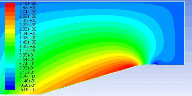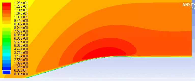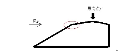 通過CFD對(duì)該地形進(jìn)行模擬(下圖左方為上風(fēng)向),發(fā)現(xiàn)風(fēng)速最大的地方位于山坡與山頂拐角處。該位置壓力分布也是最大區(qū)域。風(fēng)吹向山坡時(shí),近地層空氣被壓縮,風(fēng)速增大,當(dāng)?shù)竭_(dá)山頂時(shí),地形突變,空氣不再被壓縮,風(fēng)速不再增加,甚至在后方形成渦流,降低風(fēng)速。