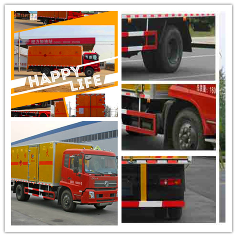 整車發(fā)動機排氣裝置采用前置式,并安裝有排氣火花熄滅器,防止熱源對爆炸物產(chǎn)生不良影響。底盤上裝有兩條拖地導(dǎo)靜電膠帶,廂體外側(cè)安裝示廓標記燈以及手提滅火器等安全裝置。車身顏色為黃色,并有“嚴禁煙火”和“爆”字樣,貼有反光標識。