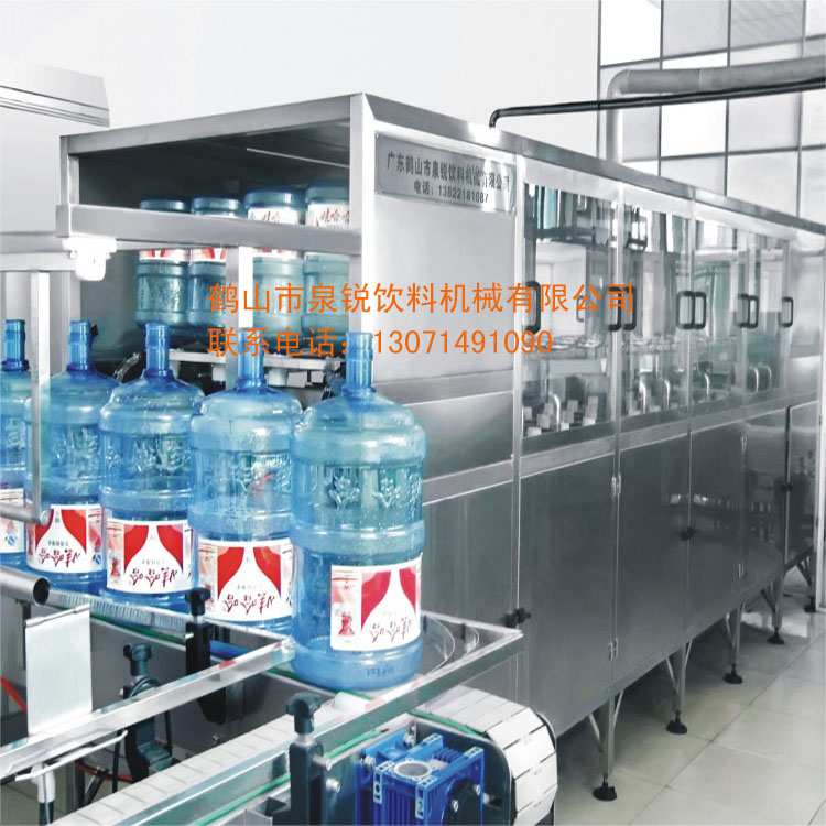 鶴山市泉銳飲料機械有限公司生產(chǎn)的每小時2000桶桶裝水設(shè)備主要包括:空瓶輸送、在線自動拔蓋、外刷桶機、上瓶、沖瓶消毒、下瓶輸送、灌裝、套蓋、壓蓋、燈檢、熱收縮膜、自動提瓶機,成品水輸送幾部份,整個生產(chǎn)過程采用封閉式運行,紫外線殺菌