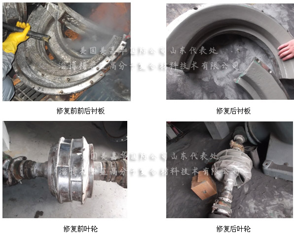 高分子復(fù)合材料本質(zhì)是高分子聚合物,具有抗化學(xué)腐蝕性,可以提高泵的抗腐蝕性,能大大增強(qiáng)泵抵抗沖蝕和抗腐蝕能力。采用美嘉華-福世藍(lán)2211F材料作為粘接涂層,再采用美嘉華-福世藍(lán)8510材料,來(lái)提升保護(hù)后的材料潤(rùn)滑性、密實(shí)性并確保具有一定的柔韌性來(lái)滿足使用。葉輪使用周期延長(zhǎng),從而減少了水泵的大修次數(shù),降低了維修人員的勞動(dòng)強(qiáng)度。